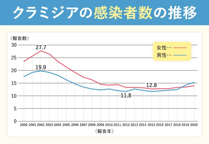 クラミジアの感染者数は2002年以降減少傾向にありましたが、2015年から再び増加に転じています。