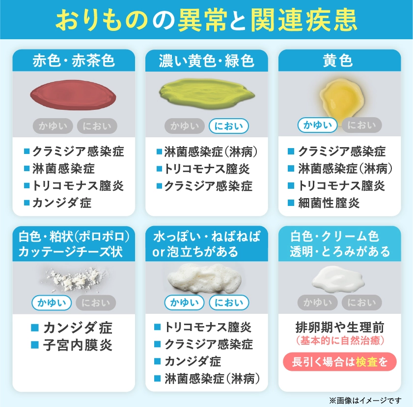 <alt>おりものの色や性病などの関連疾患のチェック画像</alt>
