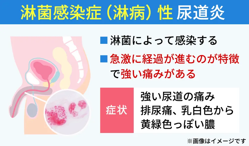 時間経過とともに急激に痛みが強くなるうえ、膿の分泌量が多いのが特徴です。また、放置することで前立腺炎や精巣上体炎などを発症するケースがあります。