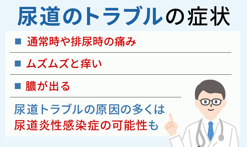 尿道に「痛み」「痒み」「化膿」などのトラブルが生じている場合、尿道炎や性感染症の可能性があります。原因を特定し、適切な治療を行わければ、悪化や他人への感染などを防ぐことはできません。